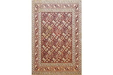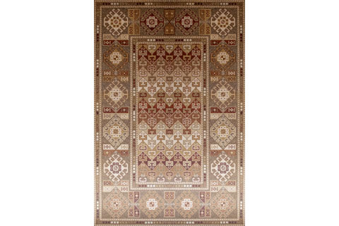 Meeting of natural wood materials with traditional carpet-rug patterns.